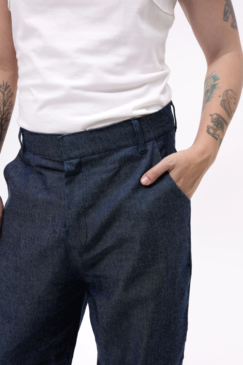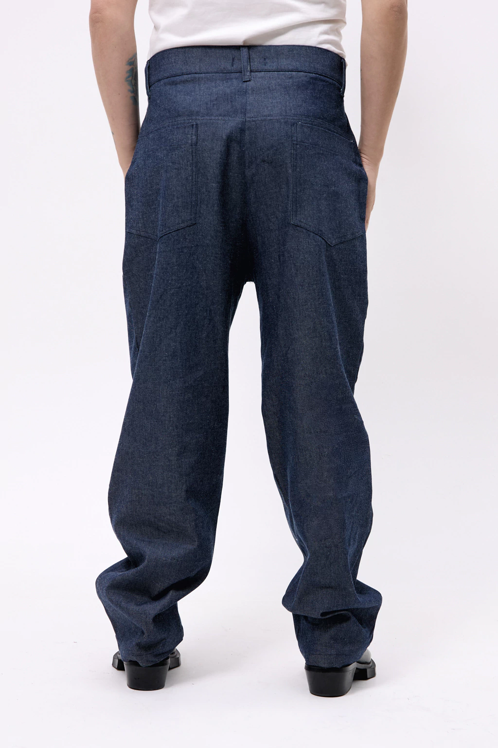 O Blue Jeans é bruto e cru — não passa por processos de lavagem industrial, o que significa que ele se transforma com o tempo, acompanhando sua jornada e adquirindo marcas únicas de uso. Além de proporcionar uma experiência personalizada, esse processo é mais ecológico e permite um jeans inteiramente uniforme em cor e textura. A calça apresenta modelagem de alfaiataria, com fechamento por colchete, bolsos faca frontais e bolsos traseiros, unindo estrutura clássica ao visual contemporâneo. O jeans tem modelagem baggy