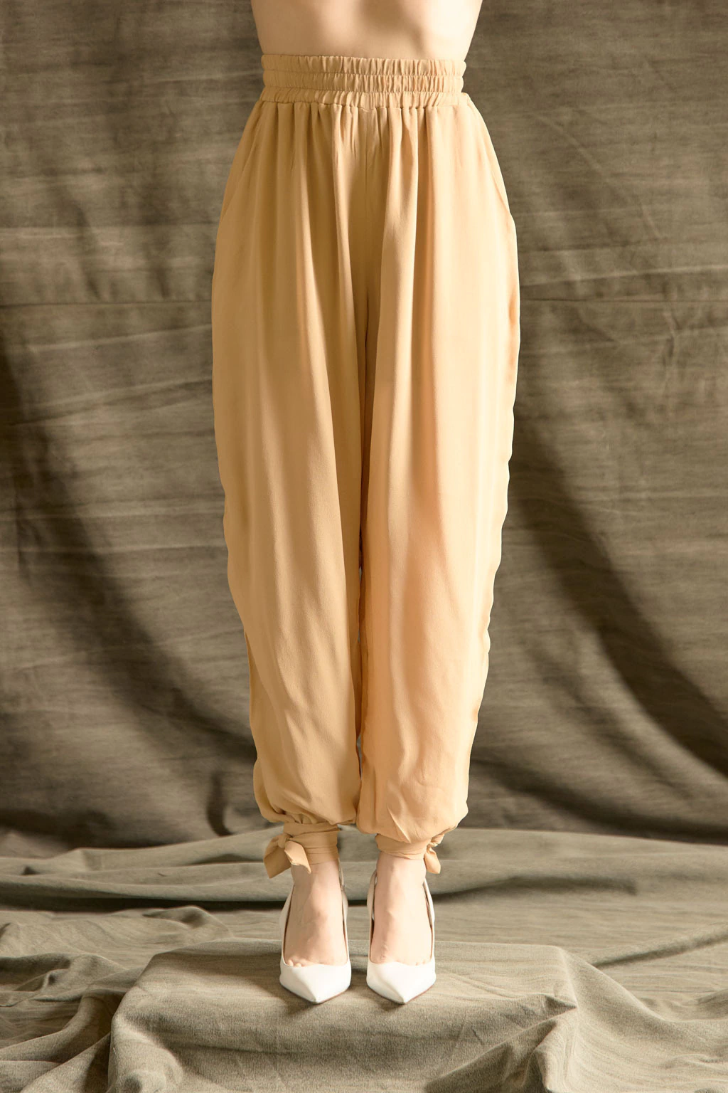 A Calça 7 é confeccionada em georgette 100% viscose na cor areia, um tecido levemente transparente que proporciona leveza e movimento. Com modelagem aladim, a peça oferece um caimento fluido e elegante. Conta com cós de elástico embutido, bolso faca lateral e forro no próprio tecido, garantindo conforto e discrição sem perder a suavidade característica do modelo.